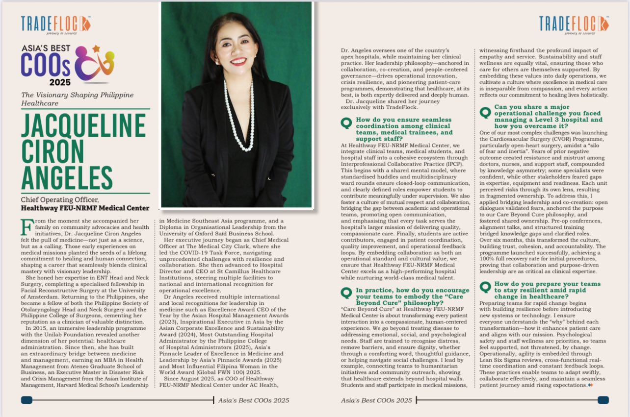 In the constellation of healthcare leadership, few stars shine as brightly as Dr. Jacqueline Ciron Angeles (FEU-NRMF Batch 2003). As the current Chief Operating Officer of Healthway FEU-NRMF Medical Center, Dr. Angeles embodies the spirit of our institution’s motto, Ad Astra Per Aspera—to the stars through difficulties. Her career is a masterclass in how unwavering dedication, compassionate leadership, and a commitment to excellence can transform the landscape of modern medicine.